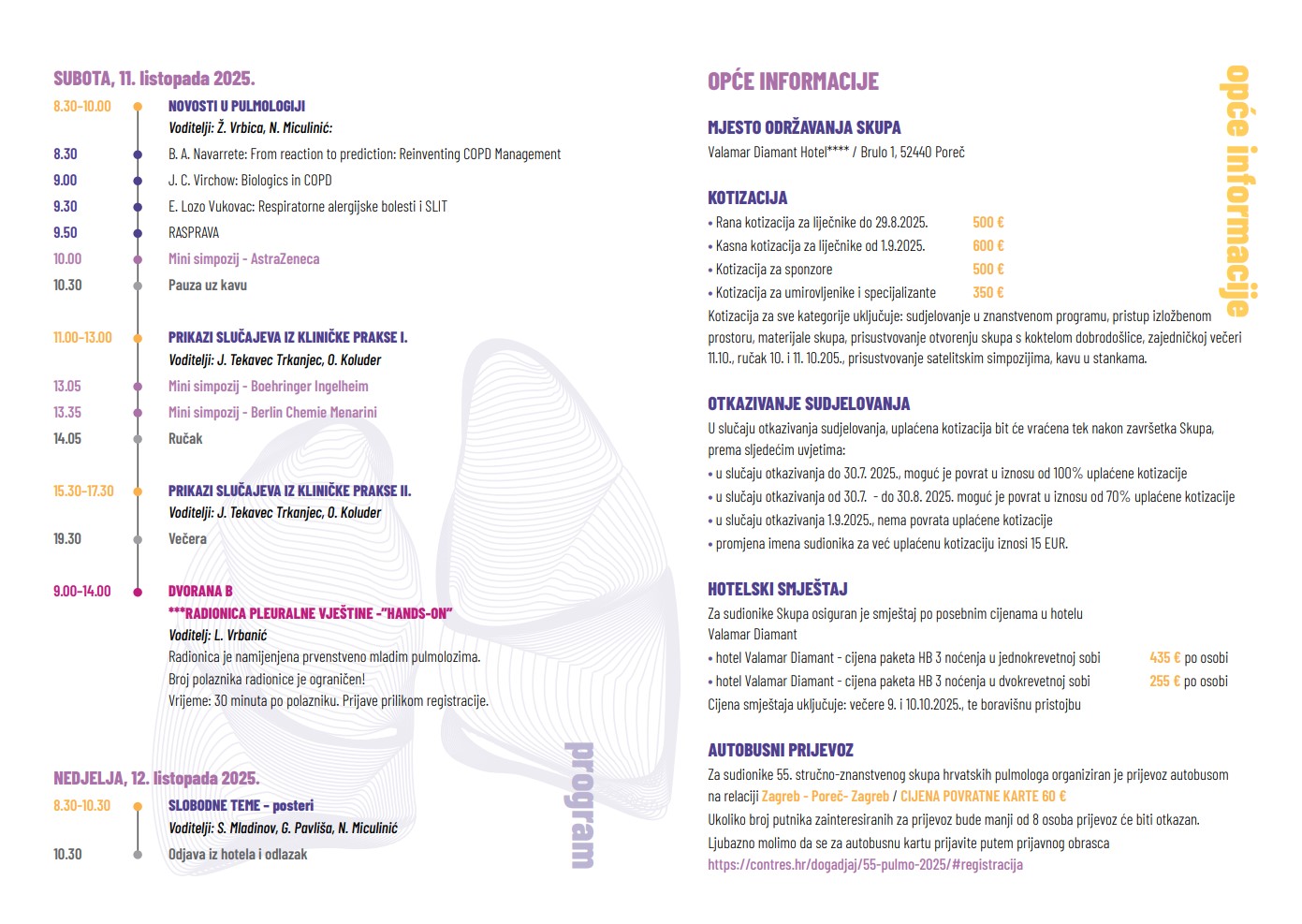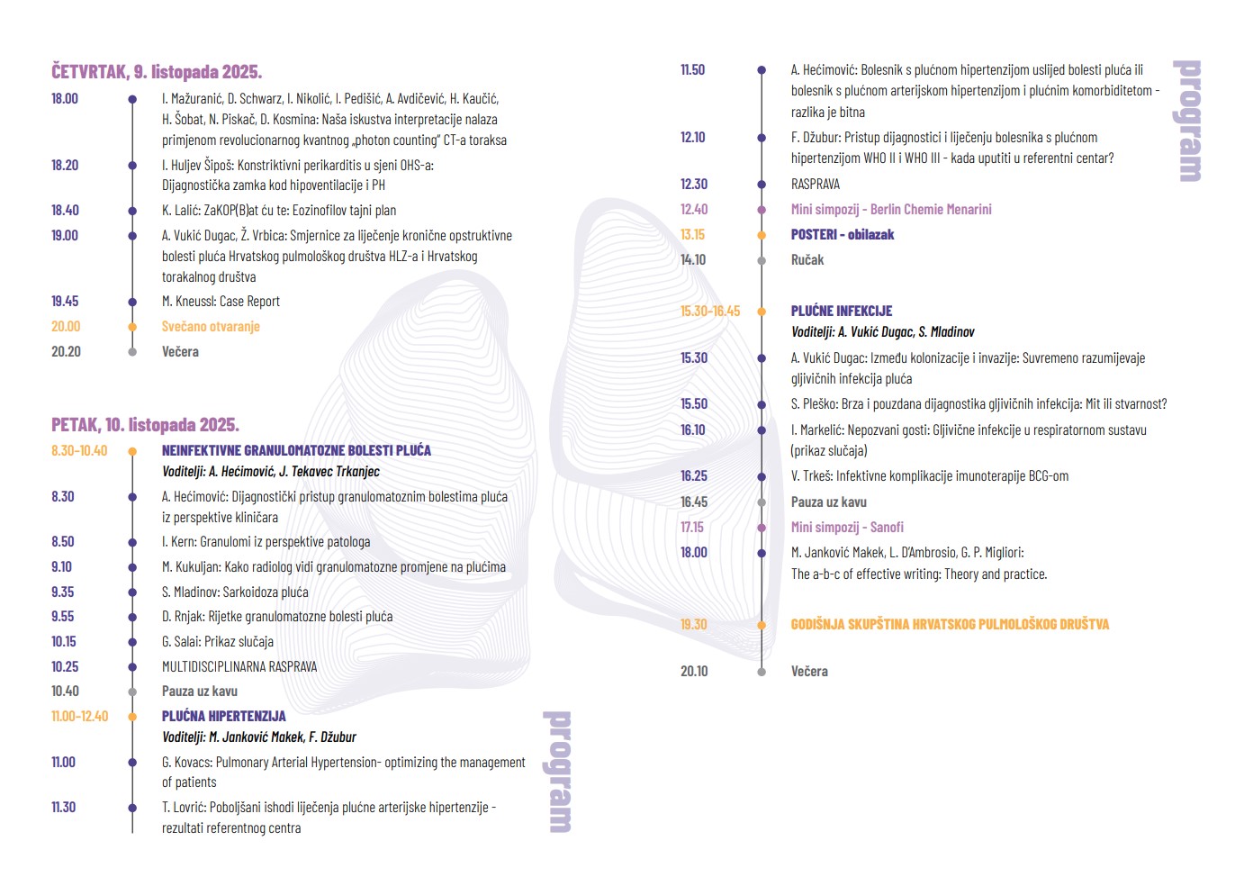 55. GODIŠNJI STRUČNO-ZNANSTVENI SKUP HRVATSKOG PULMOLOŠKOG DRUŠTVA HLZ-a – PROGRAM 9.-12. listopada 2025. Valamar Diamant hotel / POREČ GLAVNE TEME • Plućna hipertenzija • Plućne infekcije • Bolesti plućnog intersticija • Novosti u pulmologiji • Prikazi slučajeva iz kliničke prakse • Slododne teme – poster Program PDF admin2025-10-01T09:41:59+02:0001.lis 2025|